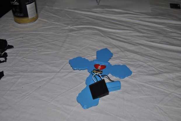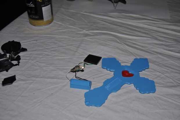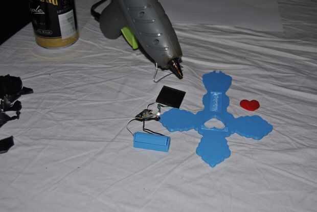 4. luego aplique un poco de pegamento caliente sobre la parte posterior del corazón y en el recuadro rectangular y montar la célula solar en el corazón y la caja de batería en el siguiente recuadro. Mientras que su se puede añadir un poco caliente a los pies de la Cruz y dejar durante unos minutos.