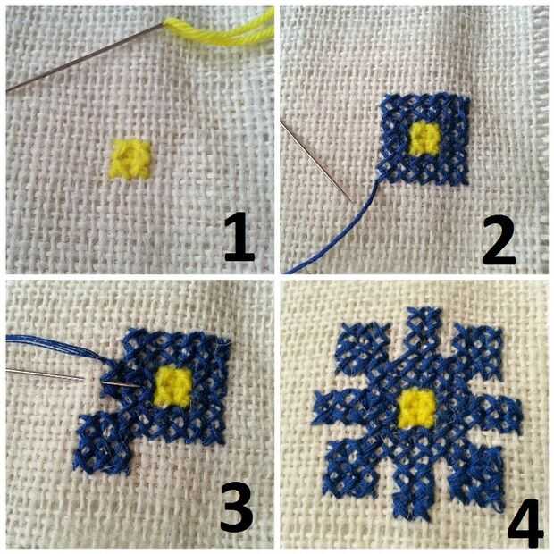 - Elegir un punto de partida en la tela (es mejor comenzar desde el centro de cualquier diseño para Cruz de costura) y sacar la aguja de la parte inferior de la tela hacia arriba.