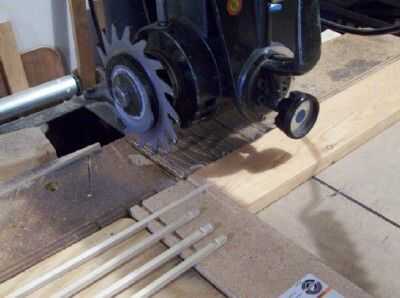 La foto muestra mi hoja de mortajar ajustable en mi sierra de brazo radial. Sujeta una pieza de aglomerado de 3/4 pulgadas de un pedazo de estanterías baratas que había dejado como chatarra. Es cuadrado a la cerca. Se encuentra la hoja de ranurar para cortar un ancho de 1/4 de pulgada. Antes de establecer la hoja de ranurar para cortar a una profundidad de 1/4 de pulgada e hicieron un canal a través de la pieza de la estantería. Uno de los tacos cuadrados está descansando en el canal de la foto. Esta plantilla tiene la espiga cuadrada cuando se cortan para un empalme de regazo, y que mantiene los dedos lejos del camino. El dado se muestra cortes 1/8 de pulgada por debajo de la superficie de la pieza de la estantería para el empalme de regazo. He añadido un trozo de pino junto a la valla para actuar como una parada. La distancia entre el borde derecho de la ranura de corte y la parada está a 3/8 de pulgada. Cuando cortos mis piezas de espiga cuadrada, comencé a usar bastones de empuje para mantener los dedos fuera del camino.