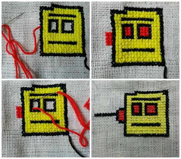 Utiliza hilo de rosca rojo para llenar los ojos y la parte de la antena conectada a la cabeza (a la derecha),