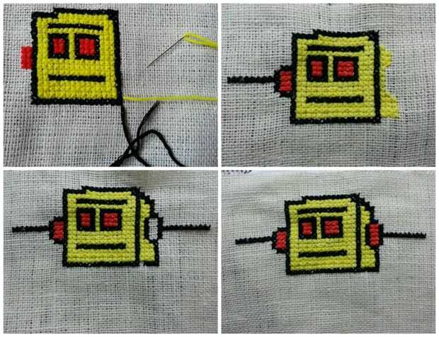Tomó el hilo amarillo otra vez para completar el lado izquierdo de la cabeza, luego la Cruz había cosida una frontera alrededor de él y completó la otra antena.