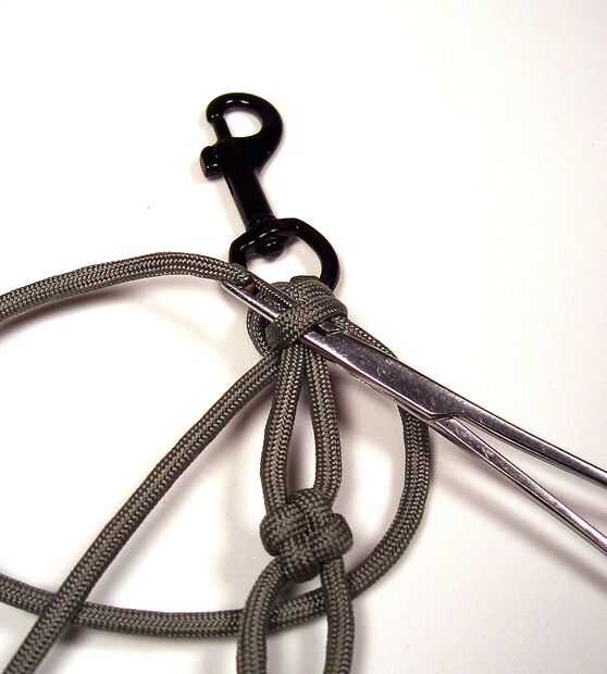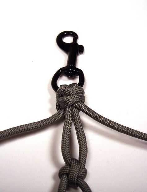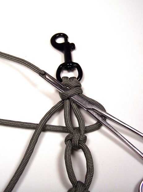 Vuelta la cuerda de seguridad, por lo que al otro lado del nudo es hacia arriba. La cadena de trabajo ahora en el lado derecho se pondrá bajo las cuerdas, atrás, arriba y abajo a través de las líneas paralelas del nudo como se muestra y apriete. Continúe este proceso y bancos la cuerda sobre el derecho del filamento bajo respaldo alrededor y a través de las cuerdas paralelas y apriete... Continuar hasta que se acaba el cable o alcanza el nudo cruzado.