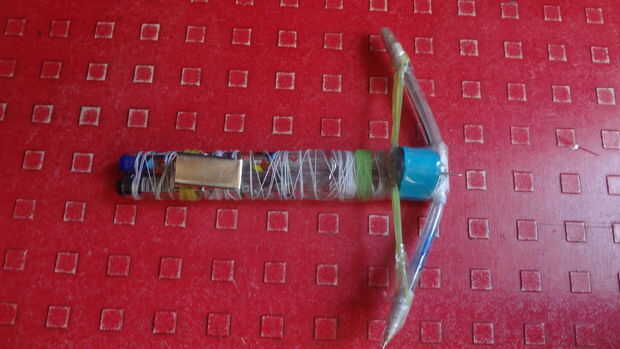 arco madera que dispara madera kebab pega 10m no hay gatillou usar el dedo para mantener en su lugarmina finisjed apagado con alguna cinta de pato sobre él para hacerlo más confortablePaso 1: equipo y meterialspara ello, se necesitatablones de madera