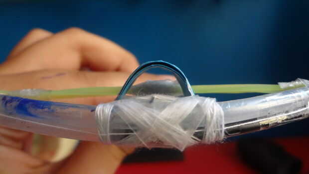 Tomar el pedazo de papel y hacer una curva fuera de él. Luego pegarlo sobre el pasador dejando una separación de unos 3 mm aprox.