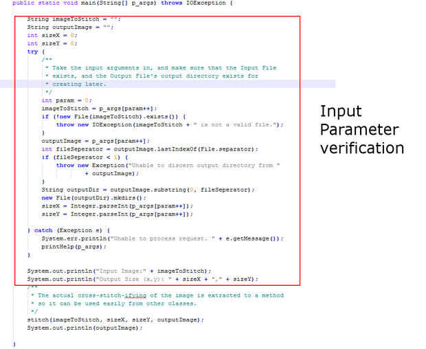 Esto significó tomar en jpeg. Esta parte tiene algunos métodos específicos de JAVA bastante, pero al puerto a su idioma de elección debería ser trivial. Aquí recibimos los parámetros de entrada, verificar la imagen de entrada y asegúrese de que podemos crear el archivo de salida.