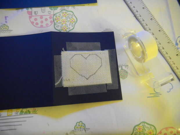 La pieza de tela o de rejilla impresa a la pieza exterior de tarjeta con cinta scotch, asegurar que el corazón está situado en el centro de lo que será la parte delantera de la tarjeta de la cinta. Tenga cuidado con el tipo de cinta scotch que usa - celo regular (que tenemos en el Reino Unido) puede causar marcas cuando se saca. "Invisible scotch tape" (disponible en tiendas de artículos de papelería) es perfecto para esto.