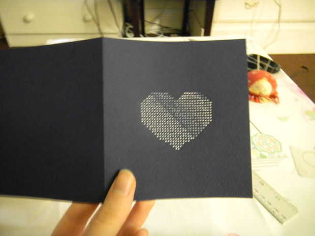 Usando una aguja de coser fuerte, meter agujeros a través de la tarjeta en cada punto en el corazón que has dibujado (incluyendo la frontera del corazón) para hacer los agujeros de costuras. Mira la segunda foto para ver esto como se verá. Asegúrese de que colocar un pedazo de tela suave o cartón debajo de la tarjeta para proteger la superficie de trabajo.