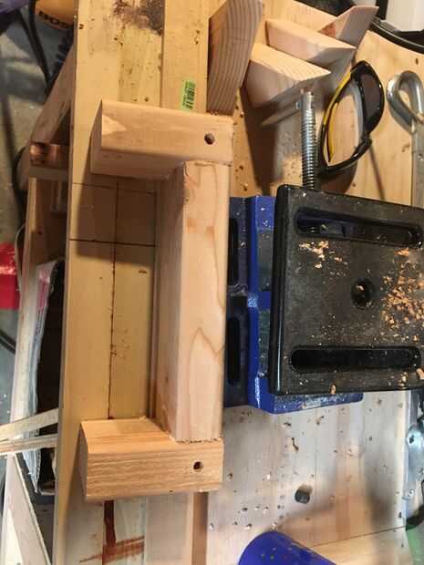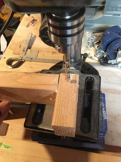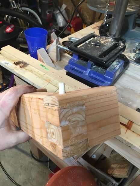 Luego limpió el pegamento con algún polvo de la sierra y decidí probar algo otra cosa demasiado jeje, así que tomó la pieza pegada a mi taladro y regular la prensa para que la broca fue casi toda la manera a través, pero en realidad no salió el otro extremo, asegúrese de usar la misma broca de diámetro como tus tacos. Entonces agarré mi pegamento otra vez y mis tacos y mazo y manejó los dos tacos.