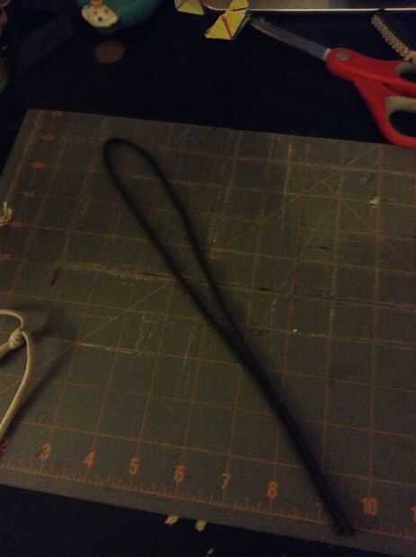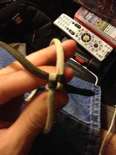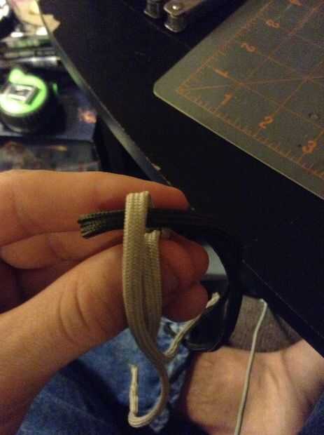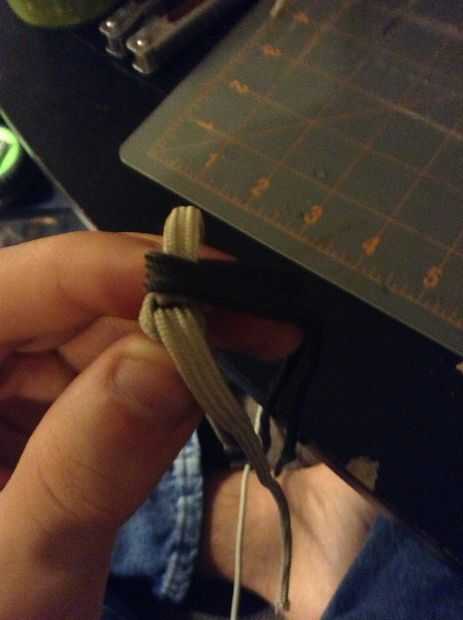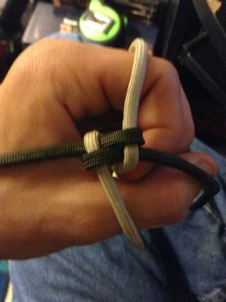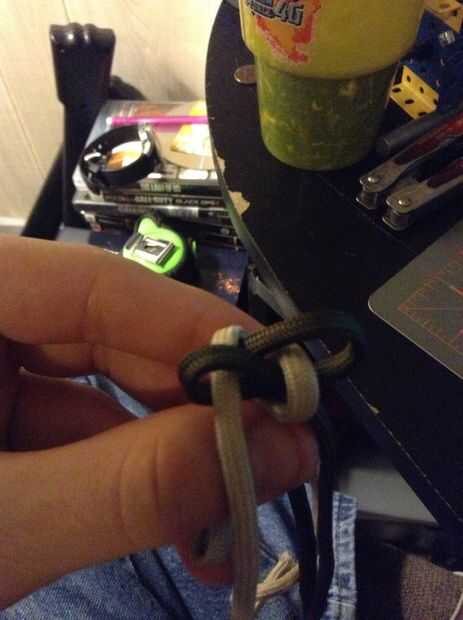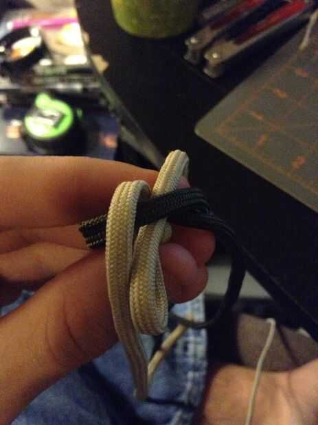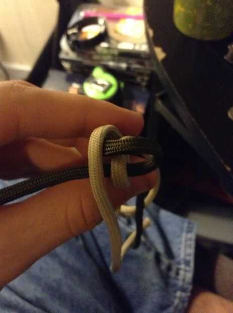 El principio de esto es un poco complicado pero desnudo conmigo. Tomar el cable de luz y sostener con el lazo de abajo y los cables colgando. Ahora toma el cable oscuro y mitad él y deslice el cable de luz a través de la u que se hace por el cordón oscuro. Ahora tire del cordón de luz sobre la oscuridad y esto debe hacer un arco. A continuación poner el cable de luz opuesto entre las dos cuerdas oscuras. Ahora toma el cordón oscuro superior y ponerlo a través del arco inferior. Luego tire hacia atrás con el cable de luz y por el arco otra vez. Ahora sólo tire de las cuerdas hasta que esté apretado contra el nudo para el bucle. Y asegúrese de que los cables oscuros incluso antes de ir. No hacerlo. XP