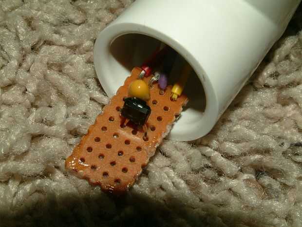 Montar las virutas de IS471 y tapas en tablero perf cortar para caber en la abertura de las tapas. Taladre un agujero en la tapa e instale un pedazo de tubo de latón de 1/4"(o lo que tengas alrededor). Asegúrese de que saber qué lado de la IS471 es el lado del receptor. Usted quiere que su LED, no la tapa de derivación se enfrentan! Conecte los cables a la Junta de IC-allí será un total de cinco conexiones de salida Vcc, Gnd y LED. El quinto cable conecta el ánodo del LED al Vcc. Decide donde quieres poner el conector en el marco de la tubería y asegurarse de que los conductores de la IC sean lo suficientemente largos para llegar a ella.