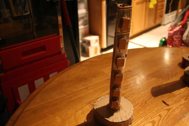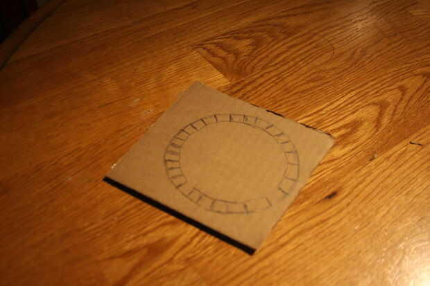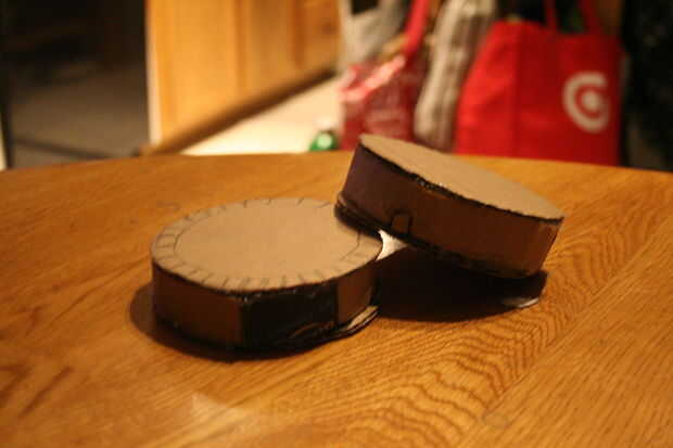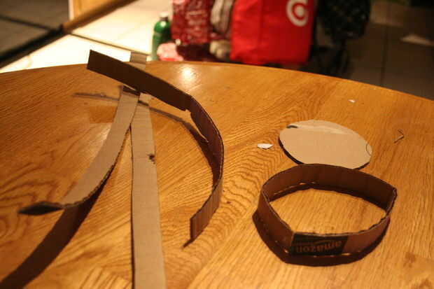 Trazar otra vez una vez la lata de pringles. Ampliar el círculo un poco más. Cortar ese círculo. Rastro que tres veces y cortado para que tenga 4 círculos. Luego, mida la circunferencia del círculo y cortar dos, cartón ancho pulgadas tiras de la longitud de la circunferencia. Luego pegar estos juntos para hacer dos cilindros poco profundos.