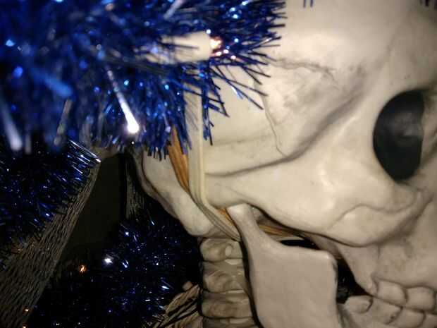 Tomé una de las bandas elásticas para la cabeza y ponerla sobre el cráneo por lo que fue de la parte superior de la cabeza debajo de la mandíbula. A continuación, cortar tiras de oropel guirnalda y se deslizó, hasta el punto de la mitad de la longitud, bajo la venda de elástico para que la tensión de la banda llevó a cabo en el lugar. Utilicé unos 8 a 10 trozos para el pelo largo y una pieza pequeña para el flequillo.