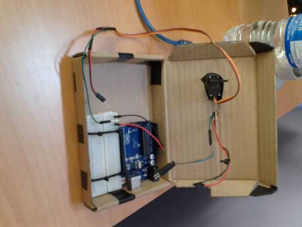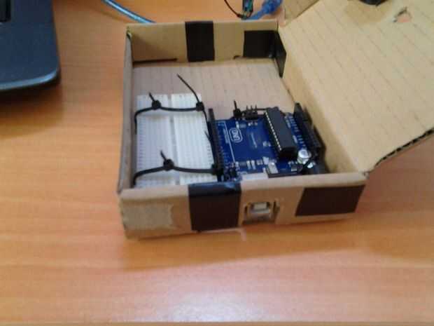 Lo primero es lo primero, permite obtener nuestras piezas listo. Si usted decide tomar el camino de Patricia y usar una caja de cartón, asegúrese de que usted decida donde desea su Arduino, protoboard, servo y orificio de cableado del sensor a colocar. Asegúrese de que el Arduino se colocará en alguna parte donde se lo puede introducir en fácilmente (que tendrás que hacer otro agujero para esto, ya que tengo). Usted puede utilizar cualquier método que se le parezca para garantizar a éstos a la caja. Yo usa zip lazos para fijar cosas en su lugar. Asegúrese de que también hacer un agujero para la parte inferior del servo y los cables del sensor para caber a través, preferentemente, cercanos unos de otros.