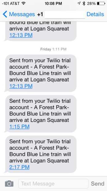 Si usted no recibe un texto, echar un vistazo a la salida en el terminal. El código devolverá un error que dice lo que te falta. Asegúrese de que reemplazó todas las claves de la CTA y la API Twilio, así como los números de Twilio.