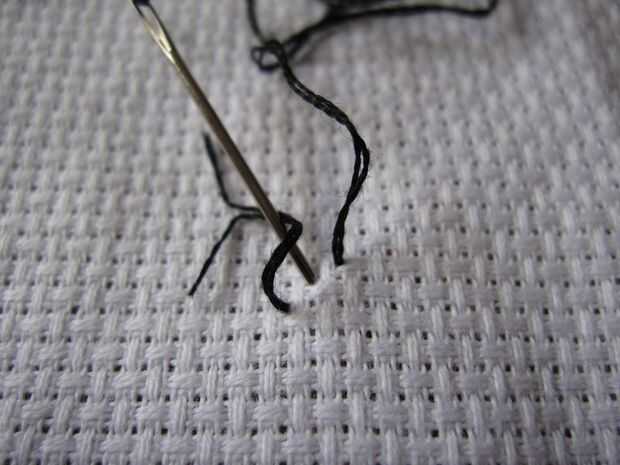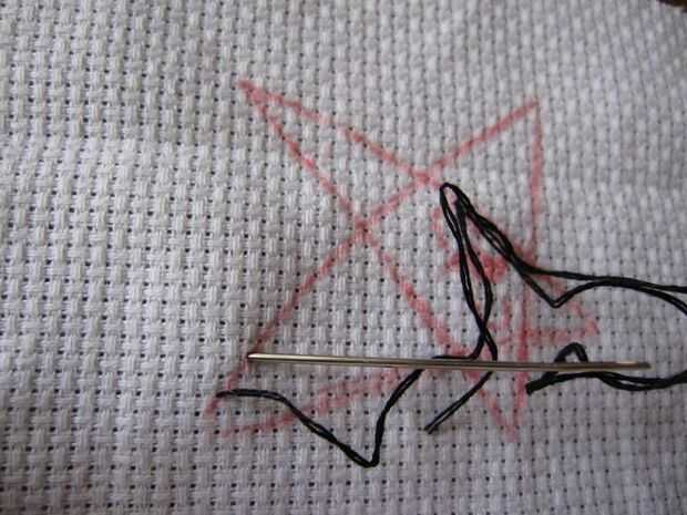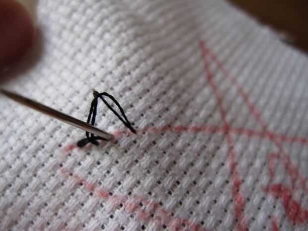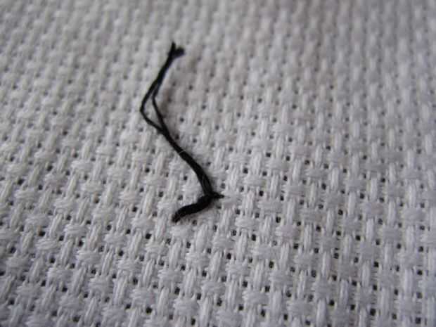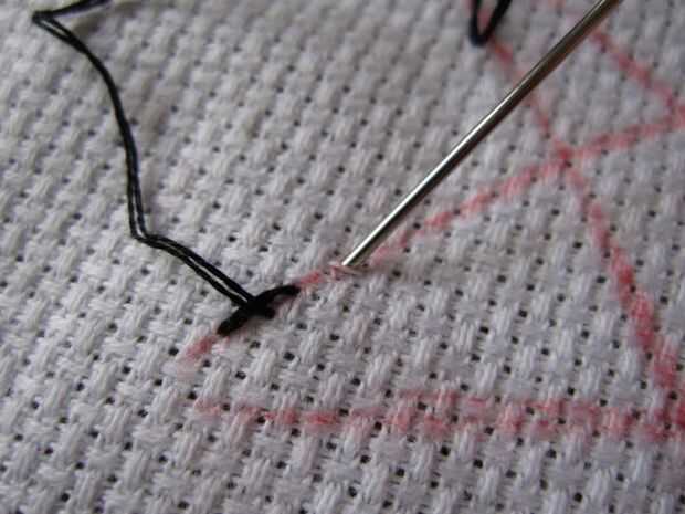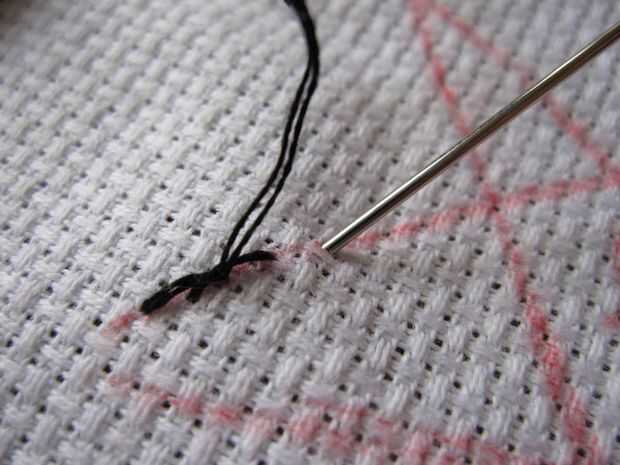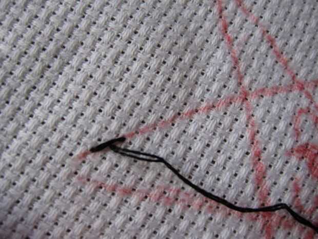 Ahora tienes el diseño en la tela. Utilice hilo negro para bordar (DMC 310) coser las líneas finas con una puntada atrás (es como coser; si no sabes google lo). Trate de no realizar nudos hay tampoco y para atrapar el extremo de su hilo con tus puntadas.