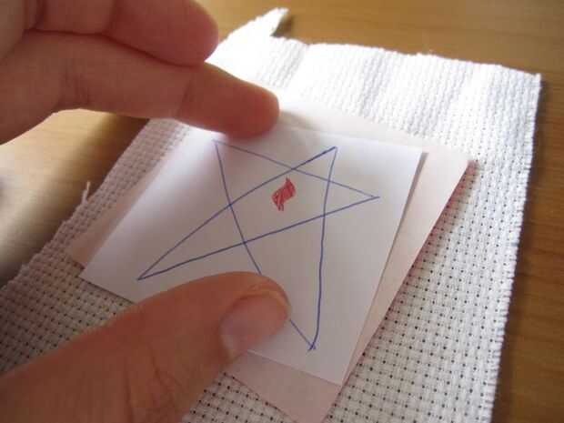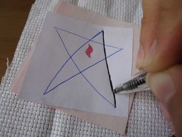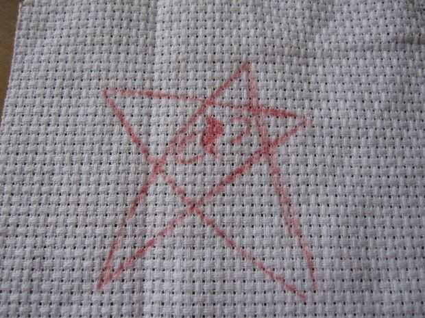 Utilizar hilo rojo (DMC 817) de la llama. Coser las líneas exteriores primero y luego llenarlo. Punto de Cruz si hay espacio suficiente para él, de lo contrario sólo tire de su hilo rojo por todas partes. Sólo trate de mantener limpia.