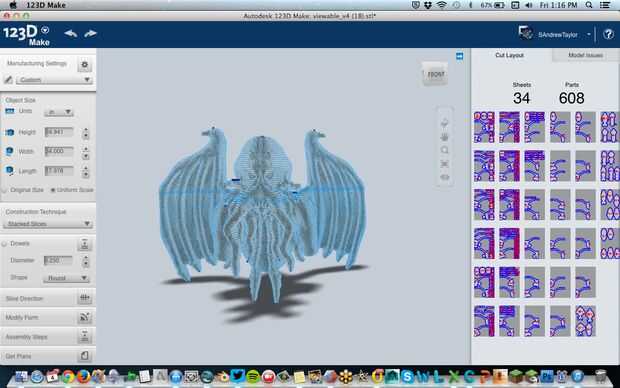 Saltar abajo pasado el tamaño del objeto a la técnica de construcción. Para mi este modelo, utiliza láminas apiladas. Empiezo aquí para que pueda ver la resolución de salir, que deberá cambiar el modelo. También verás a la derecha donde 123D Make ya comienza a trazar las trayectorias de corte, basadas en la configuración actual.