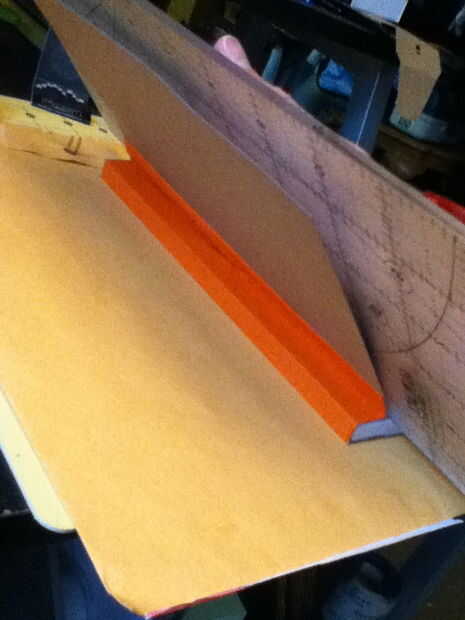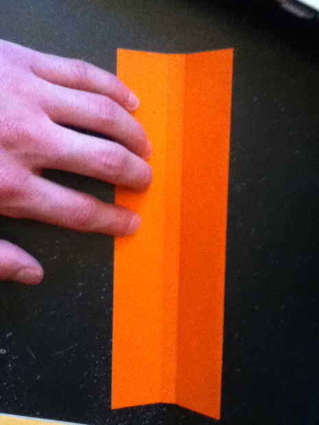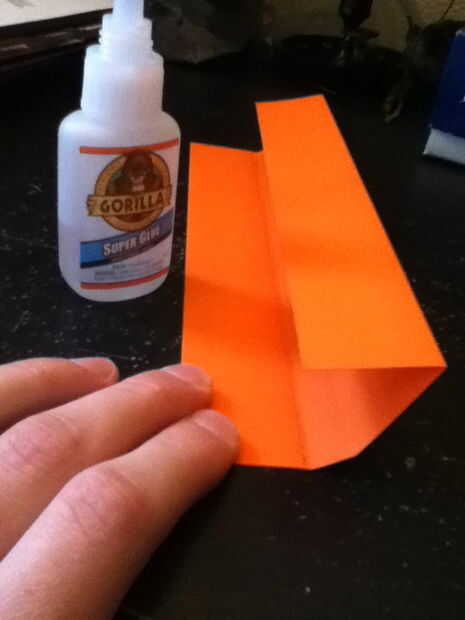 (Tip: deja algunos extra ancho de papel de color para doblar debajo de sí mismo, por lo que el borde del papel coloreado es recto y liso. Aviso en el primer cuadro del papel anaranjado – el lado izquierdo ya está doblado y pegado sobre sí mismo, y el lado derecho es doblado pero no pegado todavía.)