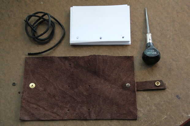 Cortar normal A4 (8 1/2 "x 11") hojas de papel. Las páginas de este libro son 4 "x 5 1/2" así que usted debe conseguir cuatro de cada hoja. Usando un cortador de papel y una perforadora, había hecho suficiente papel para unos seis portátiles (~ 700 páginas) en unos 20 minutos. Si usted tiene acceso a una prensa del taladro, los agujeros de perforación tardaría casi no a todos!