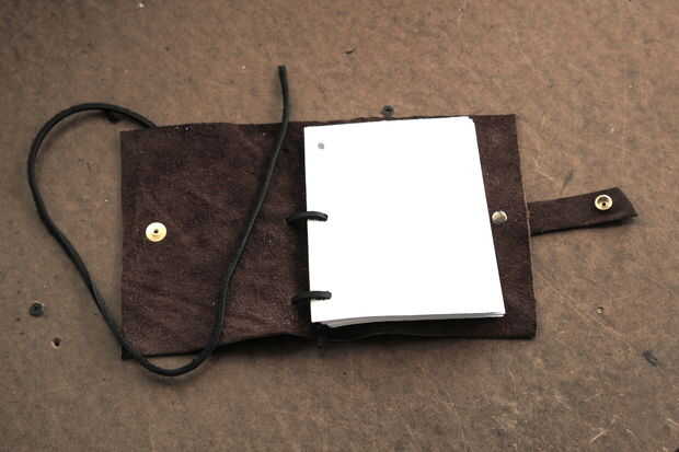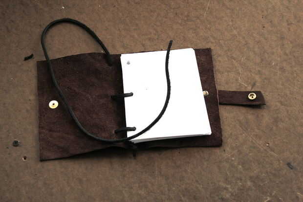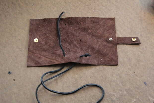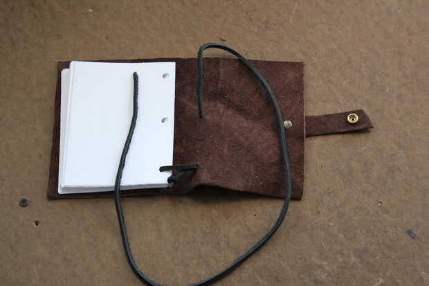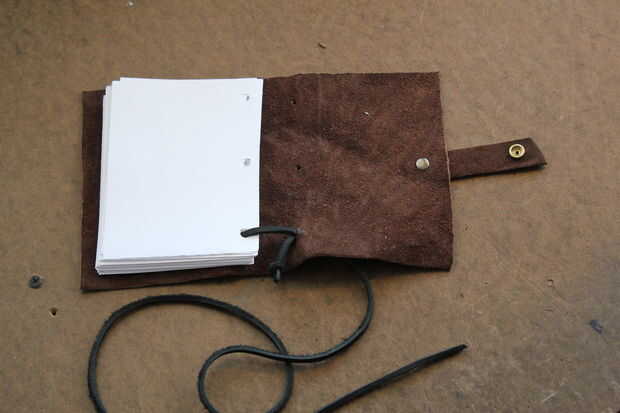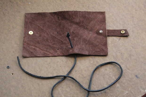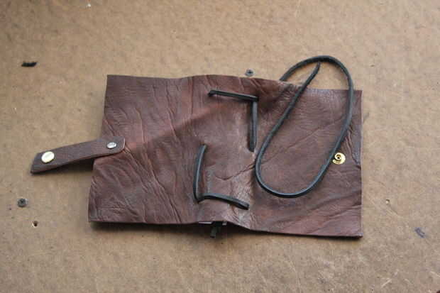 Empezar por atar un nudo en el extremo de la cuerda de cuero. Para ayudar a hilo por los agujeros, cortar el extremo de la cuerda en un ángulo. Si es necesario, utilice un punzón para estirar los agujeros. Siguen los títulos de las fotos (tienes que hacer clic en las fotos de algunas de las leyendas que sean visibles).