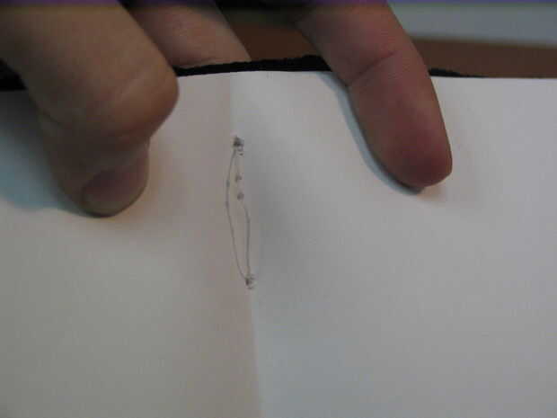 Corte una longitud de thread(floss) considerablemente más largo que la altura del libro. Un nudo en el extremo (tres nudos por todo lo alto en la parte superior entre si.) Desde el agujero exterior (orificio inferior de la izquierda) Introduzca la aguja desde el exterior de la columna vertebral, en y a través del agujero de la pila doblada, luego sale por el agujero de una pulgada por encima de él. Ahora llevar la aguja hacia arriba y a través de la parte exterior de la columna una vez más, pero a través del orificio de la parte superior media de la pila siguiente a la derecha. Tire del hilo firmemente.