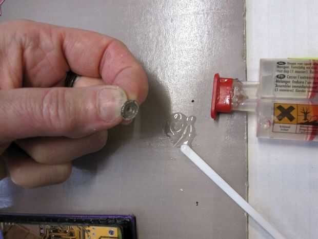 Mezcle el pegamento de epoxy con un agitador de café o algo desechable como eso. Poner sólo una proposición de pegamento en la parte posterior del botón y colocarlo en el lugar correcto.
