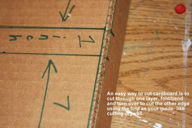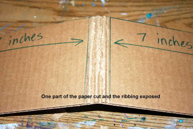 Luego con un cortador de cuchillo o cuadro exacto, corte a través del papel de un lado de la cartulina en las líneas marcadas. Luego retire el papel para revelar las costillas acanaladas para que ver algo como la foto 2. No te preocupes si no come todo apagado, está liberando el cartón para que se doblan con facilidad.