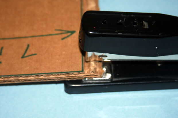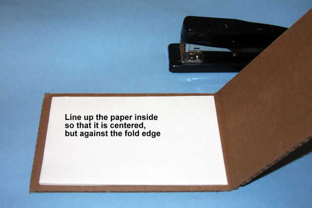Ponga su papel adentro centrándolo no aparece en los bordes y quede firmemente contra el borde del doblez. Sujete con grapa el borde doblado y papel varias veces. Asegúrese de que se aplane la parte posterior de la grapa para que no poke le más adelante (¡ ouch!) o puede empujar los agujeros y ATA para arriba el lado si usted está inclinado.