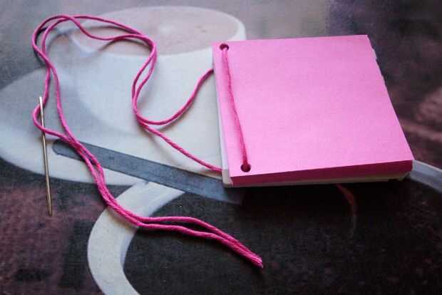 Perforar agujeros en los papeles. Colocar el papel en un disquete. Tire la cadena por los agujeros. Alinee los extremos de la cuerda para que tengan la misma longitud.