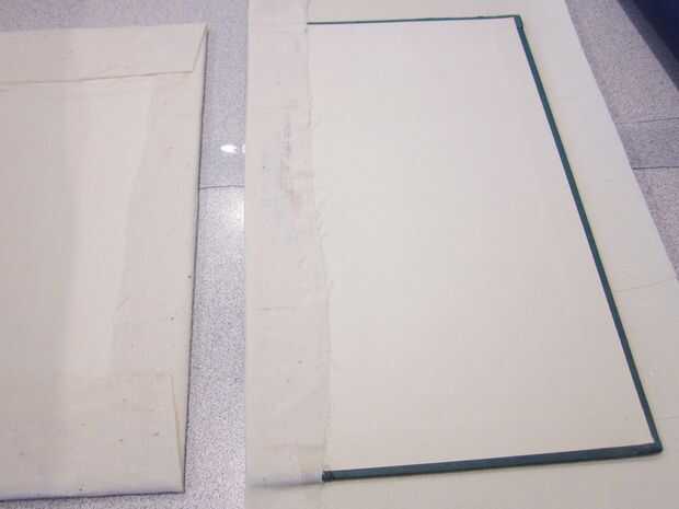 También necesitaba algo para cubrir la... cubre con. He probado con papel al principio, pero extrañamente arrugada alrededor de los bordes de la cubierta y de todos modos yo realmente el aspecto de tela. Desafortunadamente, el paño que tenía era un poco delgado y pegamento se filtró a través de ello... así que hice algunas tela de libro improvisado. Cubrí la parte posteriora de la tela con tiras de cinta adhesiva de 2 pulgadas, y tenía una especie de bookcloth. Al menos el pegamento no podía escurrirse a través de y deja manchas feas. Cinta adhesiva + paño funciona bien en un sujetador, pero sólo lo recomendaría si tienes cinta de enmascarar algo de alta calidad, buena reputación y no importa tanto su libro archivística. Aunque si importaba sobre archivo-ness, tienes tela de libro de verdad.