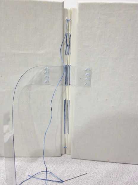 Este paso fue quizás la parte más tortuosa de todo el proyecto. He utilizado a algún tipo de variación en el atascamiento de la cinta de lino, así que tuve que atar la tira de vinilo (también conocido como la "cinta de lino") en el bloque de texto, pero había cosido el vinilo en las cubiertas... así que tuve que hacer algunos