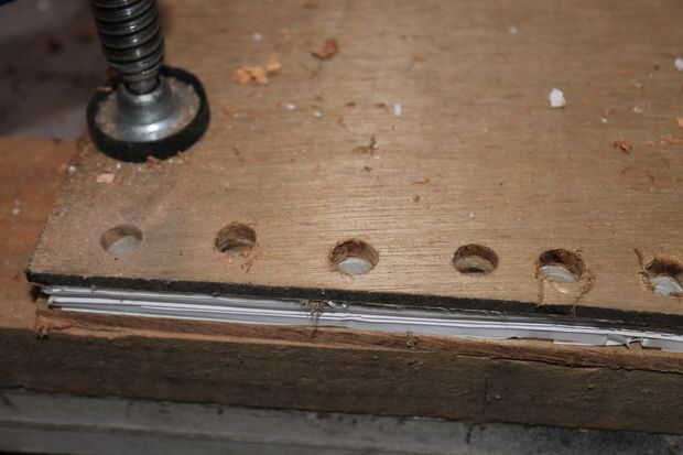 Mientras que perfora a través de las hojas de papel, fue creado un montón de calor y un poco de humo, así que dejó de perforación periódicamente, limpiar la broca y el orificio de serrín y continuó lentamente y constantemente.