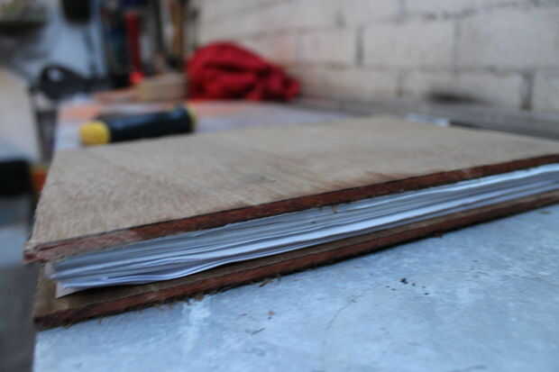 Taladré los agujeros en el lado descansa el libro encima de dos tablas de madera, y fijación en su lugar, como en la figura 2 de este paso. Es mejor hacer el libro en otra superficie de madera.