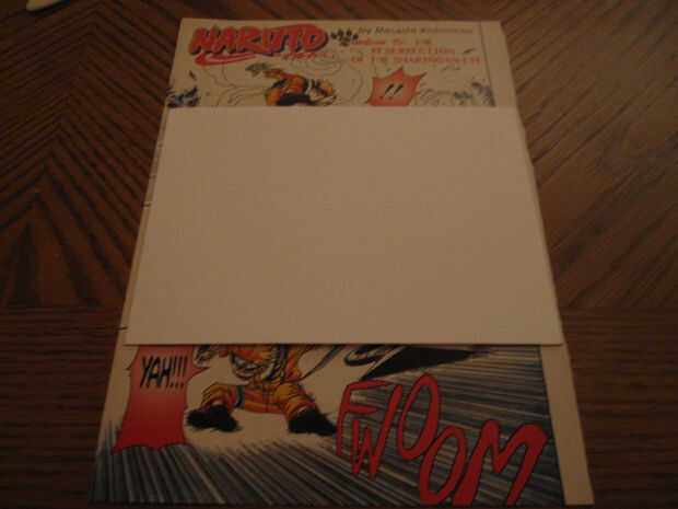 De todos modos, he encontrado una página dos absolutamente impresionante en una versión anterior de Naruto. Por lo tanto, solía un cuchillo Xacto de apagado marca perfectamente cortado de la revista que los podría utilizar como el material de la cubierta. Pensé que usando sólo la parte superior de la página, que me permitía obtener dos tapas de cada página, pero me pareció que la parte en medio de la página mucho mejor aspecto. Para este cuaderno he utilizado la página de la derecha.