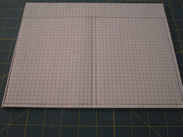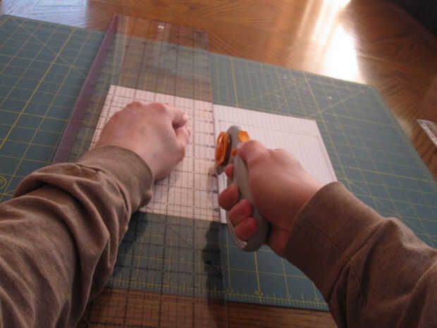 Para cortar esto para arriba, yo simplemente poner la tapa de cartulina en un bloc de papel cuadriculado y utilizarla como plantilla para marcar los bordes donde tenía que cortar. Luego usé un cortador rotatorio y unas tijeras para cortar las hojas de papel para mi tamaño deseado (otra vez, 5" por 7"). Este paso puede ser bastante lento.
