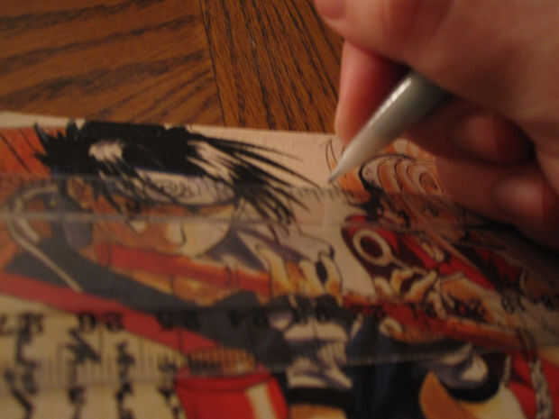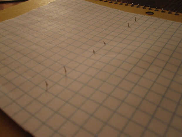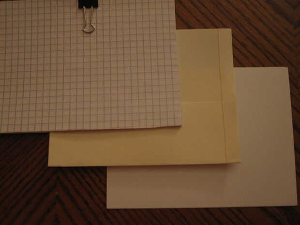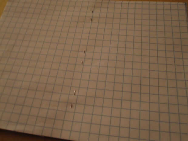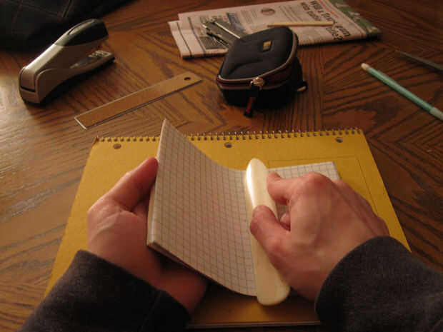 Lo primero, todos sus componentes y los alineados, superior inferior y la izquierda y la derecha. Usé un clip pequeño cuaderno para mantener todos juntos una vez dejé los alineados. Ahora, use un lápiz para hacer una leve marca en el centro de su cubierta. Te sugiero hacer esta siguiente parte engrapada sobre algún cartón de desecho para proteger su mesa. Utilicé la parte trasera de un viejo cuaderno.