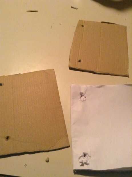 Con tijeras, una perforadora o un cuchillo xacto, hacer dos agujeros en el papel y cartón (Asegúrese de que están en el mismo lugar)