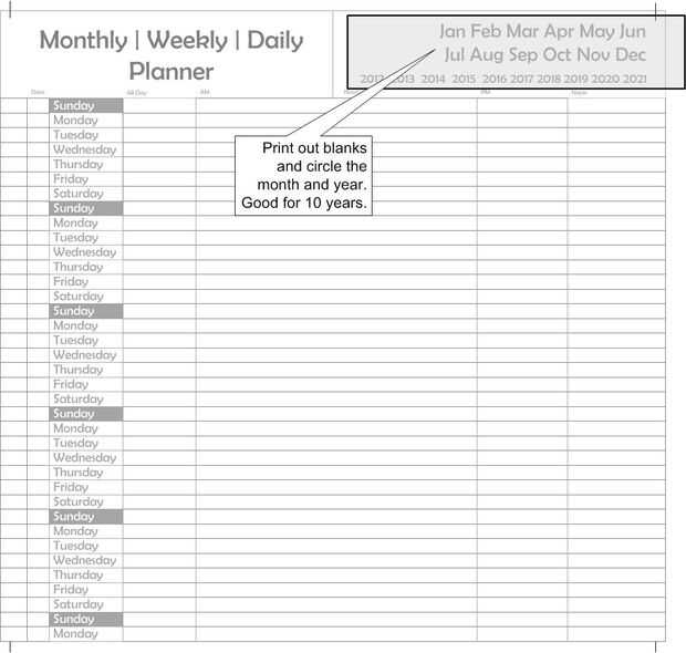 Círculo o resalte el mes y el año y los días del mes y el año de la inserción. He diseñado esto no importa cuando se produce el primer día del mes, puede utilizar el mismo diseño. Yo también he planeado este salido para un uso de 10 años.