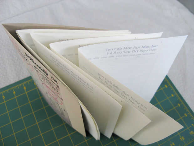 4. cuidadosamente doblar todas las hojas por la mitad como se muestra. Lo fundamental para obtener los bordes exactos. Una de las hojas tiene la impresión de un lado, asegúrese de que la hoja es el más cercano a la tapa de todas las hojas con el lado en blanco de tocar el interior cubierta.
