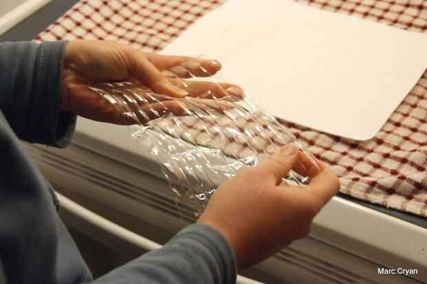 Tomar las botellas vacías y cortar la parte superior e inferior. Despegue la etiqueta y cortar por la mitad. Aplanar para que tengas un rectángulo plano. Poner entre dos trozos de papel de copia y el hierro plano. Coloque la plancha en medio, NO vapor. Pase la plancha por la parte superior durante unos segundos, escuchará y sentir el plástico aplane y encogimiento. Dale la vuelta y repetir. Cuando termine, usted tendrá una pieza plana de burbujas de plástico.