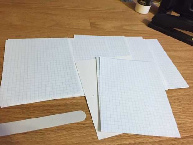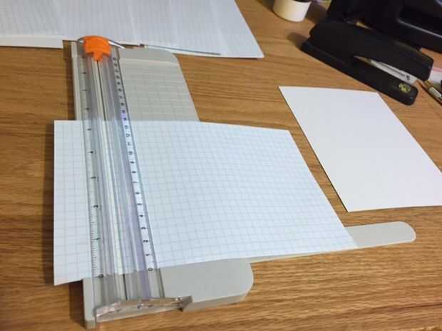 Puesto que vamos a ser plegable de una sola pieza de bristol y varias hojas de papel cuadriculado por la mitad hacia abajo el enlace del libro, se va a necesitar duplicar el ancho de su producto terminado en general. Utilice su cortador de papel para cortar todas las piezas. Ya que estoy buscando esta serie a cargo de 5 1/2 pulgadas 3 1/2 pulgadas, que corté 2 cubiertas de cada almohadilla de Bristol que mide 5 1/2 pulgadas por 7 pulgadas. Utilizo 5 hojas de papel cuadriculado para cada libro y los cortaron a las mismas dimensiones que el papel de bristol. Esto me da un total de 20 páginas individuales para cada cuaderno.