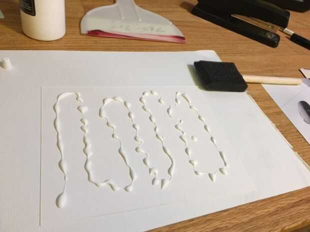Aplique una capa delgada de neutro PH adhesivo sobre un lado del papel bristol y usar su cepillo de espuma para alisar el pegamento sobre toda la hoja de papel de bristol. Desea utilizar material suficiente para cubrir toda la hoja pero no lo suficiente para causar que la tapa de la burbuja. Luego vas a querer presionar a la parte trasera de la página con la imagen que desea utilizar en la portada. Utilice su cuchillo taping para suavizar el papel al papel bristol, quitando tantas arrugas y las burbujas que puedas. Luego coloque la hoja debajo de un producto pesado. Una botella de detergente de lavadero parece que funciona muy bien. Dejó que siéntese y seca - generalmente 15-20 minutos, para asegurar una buena adherencia.
