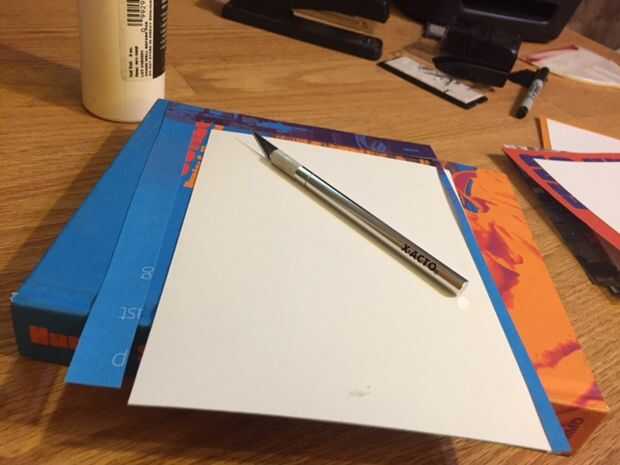 Después de estas se han secado, tome un cuchillo x-acto y trazar cuidadosamente los bordes de papel bristol para que su material de la cubierta tiene el mismo tamaño. El grosor del papel bristol hace una guía decente como usted tomarlo lento.