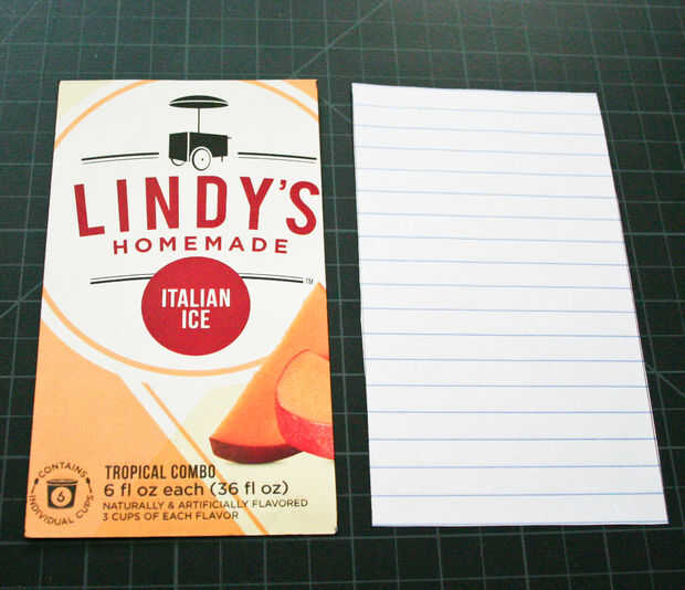 Por lo tanto, lo primero que quieres hacer es ir a través de sus cajas de cereal y cortarlas al tamaño que quieres para tus libretas. En este ejemplo, estoy usando uno de los lados de una caja vacía de helados italiana casera de Lindy. Usted quiere cortar dos piezas para hacer la parte delantera y y respaldo para su bloc de notas. Determinar los tamaños reales para tus libretas no es necesario sino opcional si desea seguir. Ahora, hacer lo mismo con su papel de cuaderno y corte hasta el mismo tamaño como lo haría con su cartulina.