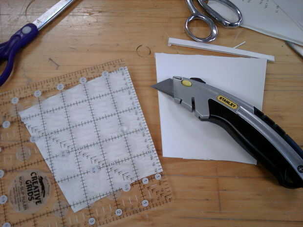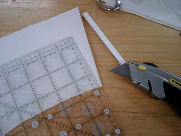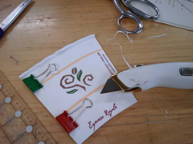 Utilice los ganchos de la carpeta a un lado o la Copa por lo que puede recortar las dos piezas a exactamente el mismo tamaño. Esto es más fácil hacerlo con el cuchillo.