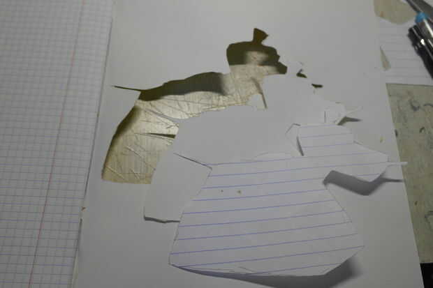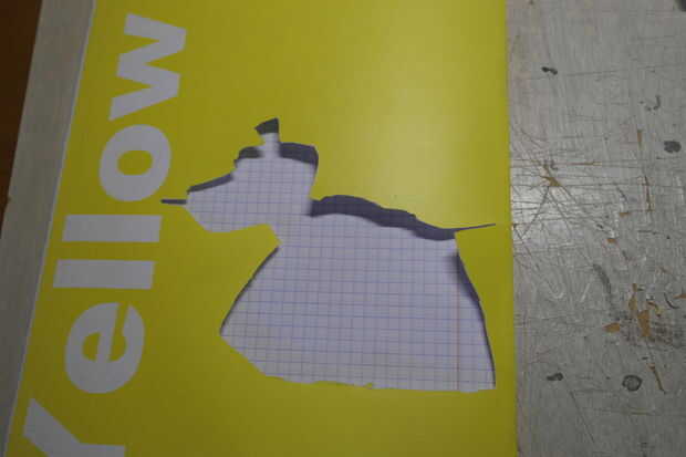 Utilizando un cúter, tijeras o cualquier otra hoja (cuchillo de carnicero, lo que es más fácil para usted usar) cortar su forma. Tenga cuidado de no sacar demasiado agresivamente la forma, o puede rasgar su cubierta. No hace falta decirlo, ver donde están los dedos; podría terminar con un cuaderno rojo (pero en serio, tenga cuidado).
