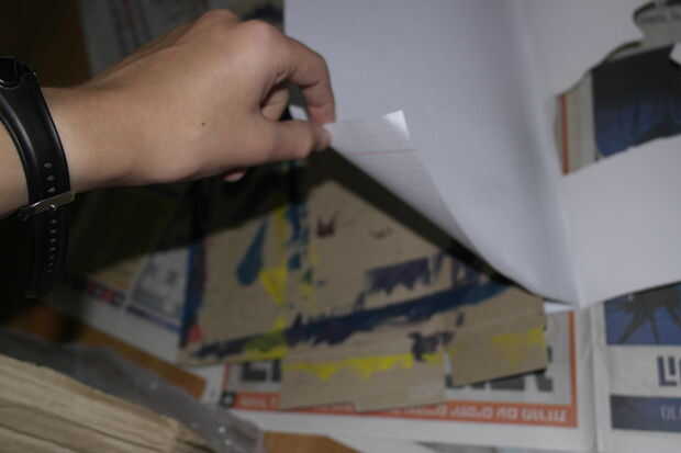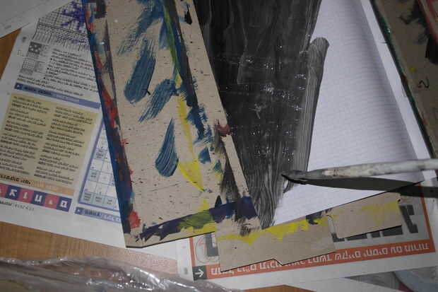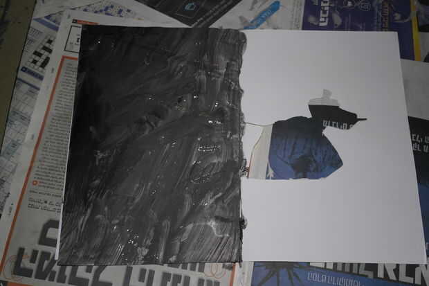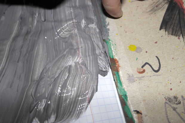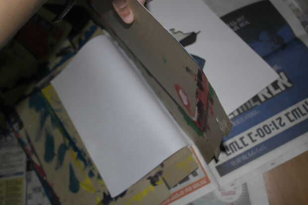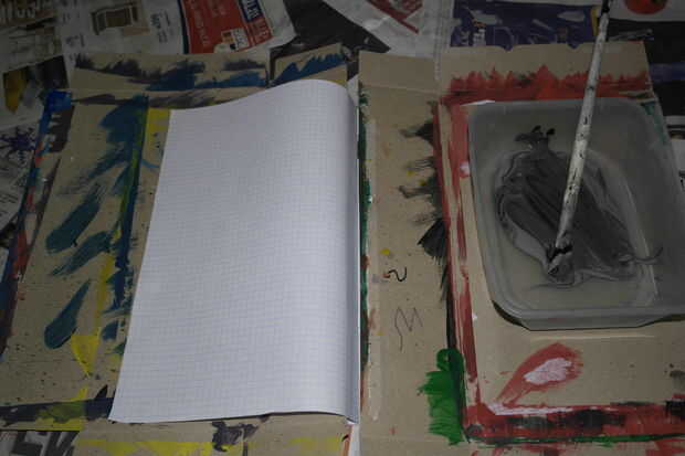 Ahora, en un pozo ed diario del piso (a menos que usted quiere pintar su piso de esa manera), coloque su ordenador portátil, con espacio libre alrededor para pintura, pinceles etc.. Solo pintura la primera página pueda recibir la notebook todo empapado, le sugiero que colocar una hoja de cartulina antes y después de la página, aislándolo de las otras páginas. Después de hacerlo, empezar a pintar la primera página. Usted puede pintar la forma que deseas, pero encuentro que unos tonos del mismo color funciona mejor. (para darle ese efecto de varios color, he añadido algunos pintura negra a la gris y confunden parcialmente. Usted puede cambiar la cantidad de pintura negra en cada golpe lo que quieras).