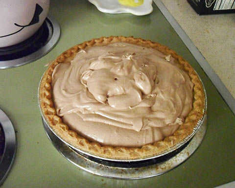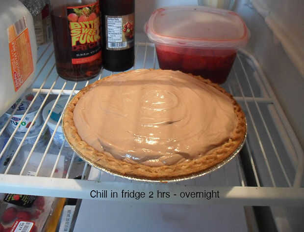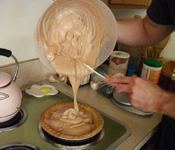 Verter el relleno de chocolate en su corteza, que tiene un tenía un poco de tiempo para enfriarse por ahora. Aquí es donde eso tazón de fuente plástico flexible viene bien; para controlar el vertido mejor doblando los lados un poco y hacer un surtidor de.