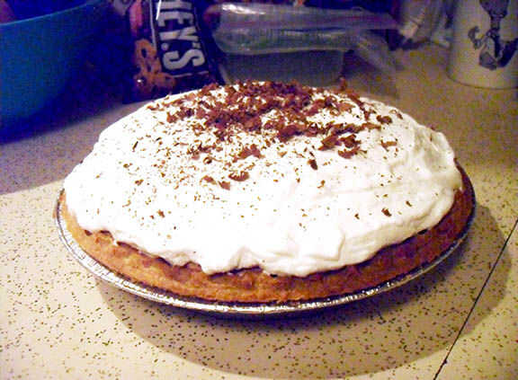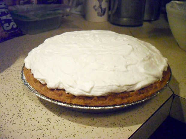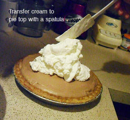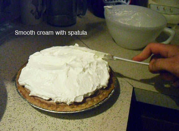 Utilice la espátula para extender la cobertura hacia fuera a los bordes de la corteza, luego alisar la superficie de la crema.
