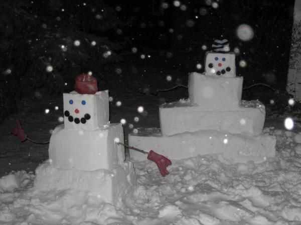 personas Plaza nieve hice un par de años atrás. Todo, era mi pala de la nieve, cajas de trabajo, powerade las tapas de las bocas, tapas de sprite para los ojos, coque tapas para las narices, palillos para los brazos y no olvidemos los guantes y sombreros...